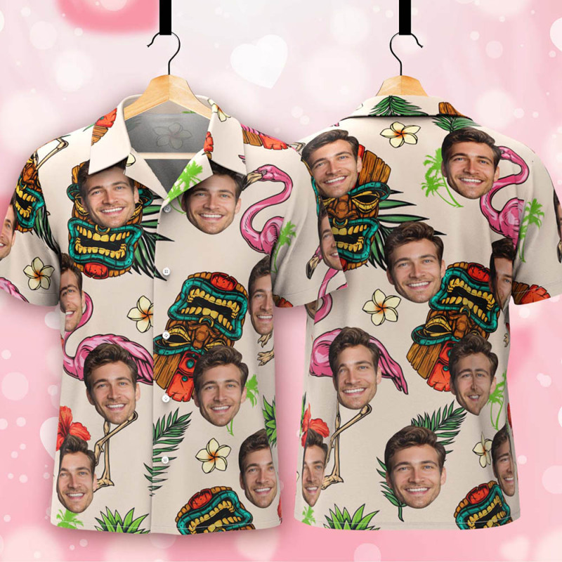 Home / Chemise Hawaïenne Blanche Personnalisée Avec Icônes Tropicales Tiki Et Flamants Roses, Look De Plage Personnalisé