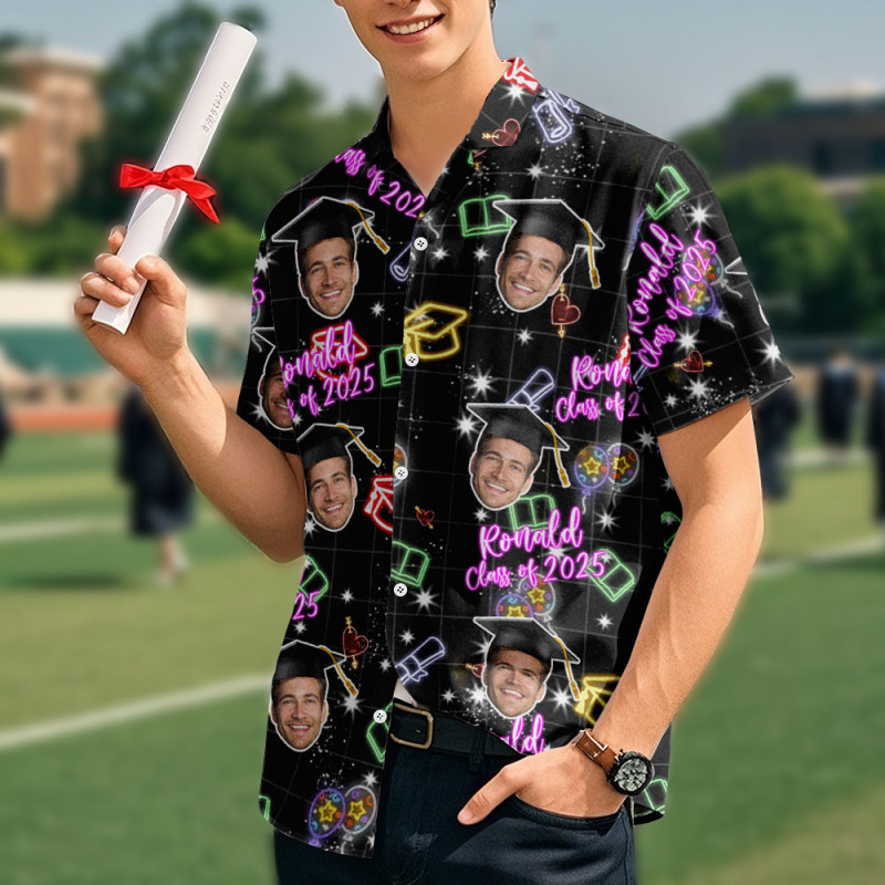 Affiche ton visage (ou le leur !) sur cette chemise hawaïenne personnalisée hilarante et assure que tout le monde se souvienne de la remise des diplômes avec style. Que ce soit pour une farce de fin d'études, une tenue de fête de remise des diplômes ou simplement pour témoigner son affection, cette chemise est source de rires, de regards et d'ambiance.