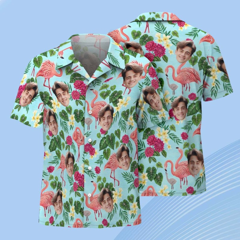 Accueil / Chemise Personnalisée Chemises Hawaïennes Personnalisées Avec Flamant Rose Coloré, Chemise De Plage Aloha, Bleu Clair