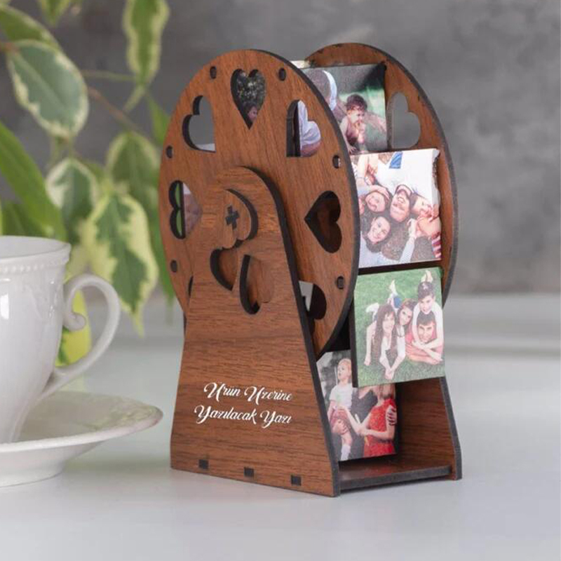 Offrir un cadeau est aussi spécial que d'en recevoir un. Pour offrir à vos proches un cadeau unique et précieux qu'ils pourront conserver toute leur vie, optez pour la Mini Grande Roue Personnalisée avec 8 Photos.Vous pouvez y insérer 8 photos de la personne à qui vous souhaitez offrir ce cadeau, ainsi qu'un message personnalisé gravé sur la partie en bois.Les photos sont imprimées avec la technologie UV et le message est gravé au laser. Aucun risque d'effacement.Matériaux : boisLargeur : 15 cmHauteur : 20 cm