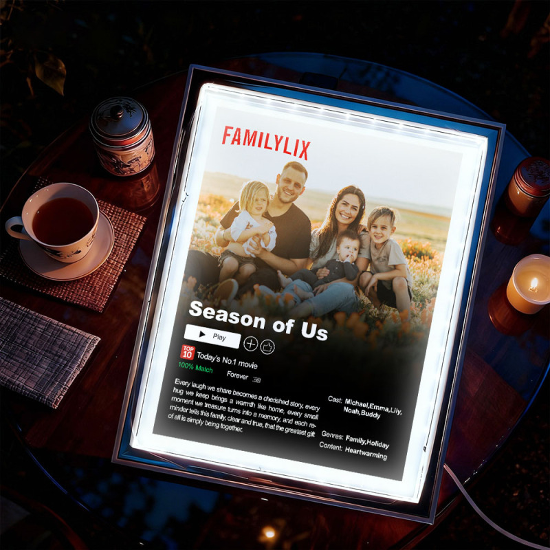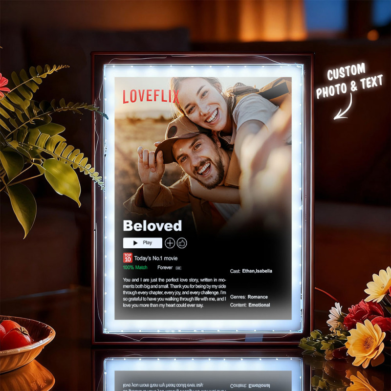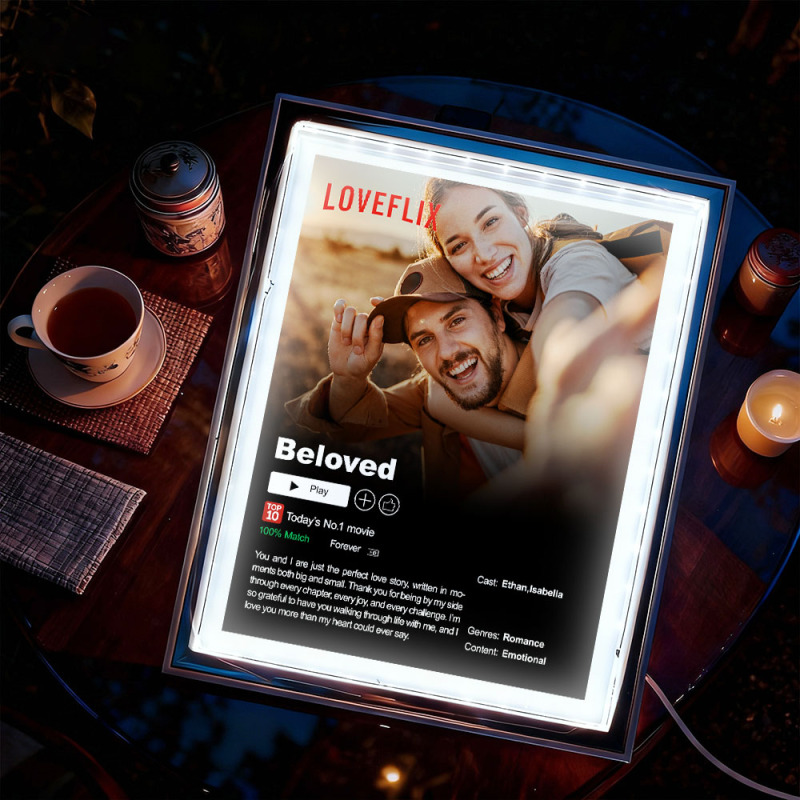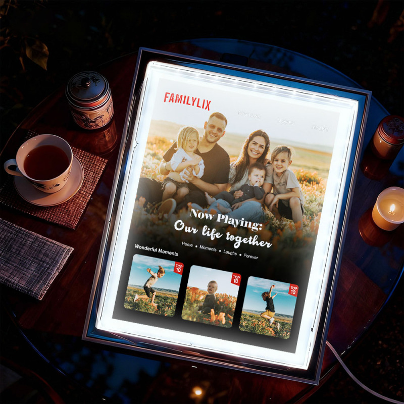 Transformez votre histoire d'amour en un moment magique avec ce cadre lumineux photo personnalisé « Lecture en cours ». Inspiré des interfaces de streaming, ce cadre LED romantique vous permet de personnaliser vos photos, titres et mots précieux pour mettre en valeur vos plus beaux souvenirs.